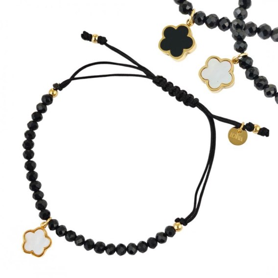 Bransoletka wykonana ze stali chirurgicznej platerowanej 14-karatowym złotem połączona z czarnym, regulowanym sznurkiem to biżuteria o nowoczesnym i eleganckim charakterze. Dwustronna zawieszka w kształcie koniczynki – w kolorze czarnym i białym – dodaje jej oryginalności i sprawia, że pasuje zarówno do codziennych, jak i bardziej wyjątkowych stylizacji.